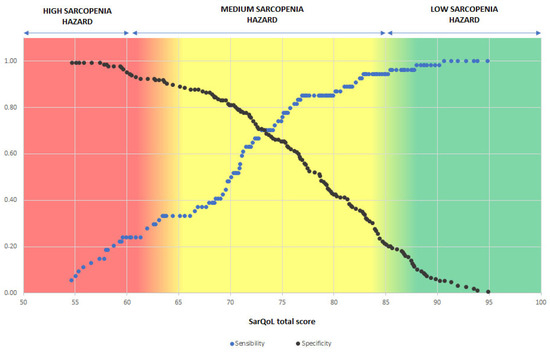 Taking into account the sensitivity and specificity in the sarcopenia diagnosis for each of the total scores of the questionnaire obtained, researchers delimited three risk areas in terms of the probability of suffering sarcopenia, regardless of sex, based on results obtained in the SarQoL questionnaire [27] test; this model can be consulted in Figure 2. Thus, obtaining a result of fewer than 60 points in the questionnaire would imply a high risk of suffering from sarcopenia; a result between 61 and 85 implies a moderate risk; and a score higher than 86 implies a low risk of suffering from sarcopenia.