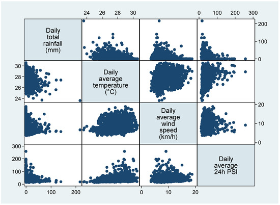 Temperature was positively correlated (Pearson correlation = 0.32) with PSI, while there was no significant correlation between PSI and rainfall (Pearson correlation = −0.096) and wind speed (Pearson correlation = 0.088) (Figure 1). Table 1 shows the characteristics of the three clusters. Generally, the days in Cluster 1 had higher wind speed (median 10.4 km/h; interquartile range (IQR) 8.4–12.2) than the other two clusters, the days in Cluster 2 had higher rainfall (median 2.8 mm; IQR 0.4–13.6), while the days in Cluster 3 had higher temperature (median 28.6 degree C; IQR 27.8–29.0) and higher PSI (median 59.2; IQR 54.8–70.0).