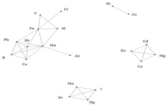 Using network analysis, the three major correlation networks’ solution among the trace elements was identified (Figure 2). In the first network of 10 elements, Mn had the most significant linkages with the other 7 elements (Al, Fe, Sb, Cu, B, As, and Pb). In the second (Se, Mo, Hg, and I) and third (Zn, Ca, Cd, and Mg) networks, each element was evenly connected to each other. Co and Ni were linked as the fourth network.