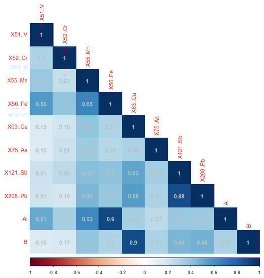 In the Mn network, Mn was strongly positively associated with Al (Pearson correlation coefficient r: 0.63) and Fe (r: 0.65) and moderately associated with Pb (r: 0.45) and Sb (r: 0.42). Al was also strongly associated with Fe (r: 0.9). All correlations are statistically significant at the 0.05 level (Figure 3).