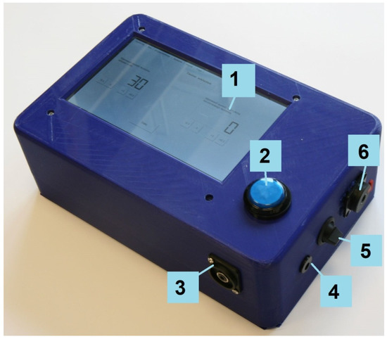 In Figure 3, Figure 4 and Figure 5, the tester made according to the diagram in Figure 2 is presented. The electronic systems of the tester were installed into a polylactic acid housing printed on a 3D printer. A battery with a capacity of 12,500 mAh was used to power the tester. The battery was equipped with suitable protections, a charging system, a battery charge indicator, and a 5 V output. The 5 V voltage is sufficient to supply all the systems, apart from the amplifier. A step-down system to decrease the voltage from 5 V to 4.2 V was used to supply the amplifier. The tester operates under special control software dedicated to RPi built on Raspbian (LINUX). The tester’s control software was developed in C++. A file system monitor was used to handle the physical user response button. The Raspbian system’s directory contains a virtual folder where information about the physical state of the I/Os is stored in a text format. Monitoring the files allows for the generation of an interruption when a given file is changed. This makes it easy to detect when a response button is pressed.
