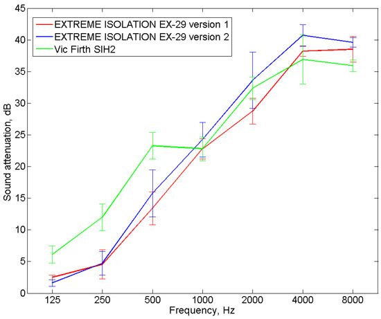 The results presented in Figure 6 indicate that the Vic Firth SIH2 headphones will more intensively attenuate sound in the frequency range of 125–500 Hz than the Extreme Isolation EX-29 headphones. The standard deviations for the frequencies 125, 250, and 500 Hz were relatively small compared to the differences between the mean attenuations. However, in the remaining range of frequencies, the sound attenuation of the tested headphones was similar. It is important to note that in the case of Extreme Isolation EX-29 headphones, the sound attenuation values at the frequencies of 125 and 250 Hz were quite low and did not exceed 5 dB. Based on the conducted tests, it can therefore be concluded that due to higher sound attenuation values, the Vic Firth SIH2 headphones were selected for use in the tester to check the correct placement of the earplugs. The differences between the sound attenuation of individual headphones are most likely due to differences in their design including the tightness of the fit of the components of these headphones. In the frequency range of up to 500 Hz, selected physical parameters such as cup volume, cushion stiffness, and cushion contact area have a significant influence on sound attenuation.
