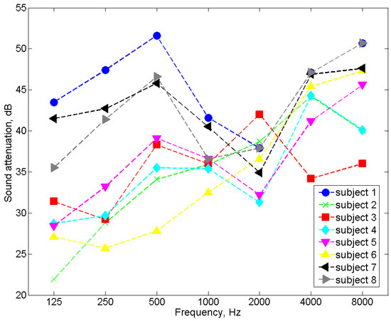 The difference between the hearing thresholds determined with and without headphones represents the sound attenuation of a particular set of headphones. Figure 6 shows the mean value of the sound attenuation of the tested headphones.