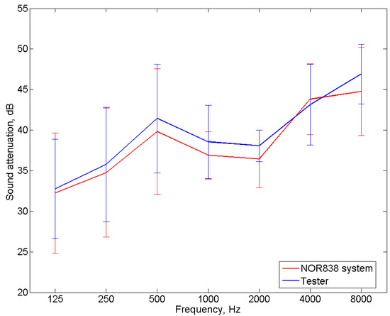 The mean sound attenuation values of the earplugs with the standard deviation measured using the tester and the Norsonic NOR838 system.