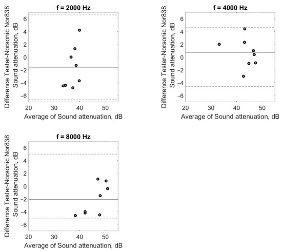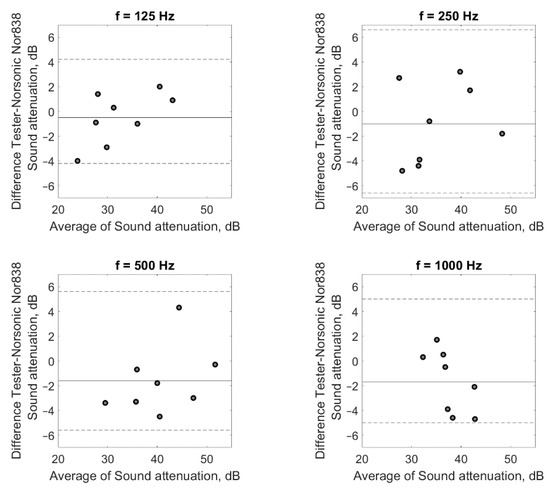 In addition to the statistical analysis, Bland–Altman plots were created for all frequencies to investigate the agreement between the two devices. The results in Figure 10 show that for all frequencies, the sound attenuation differences between the measurements conducted with the use of the tester and the Norsonic NOR838 system were between the lines denoting two standard deviations. This means an agreement between the sound attenuation values obtained for both devices.