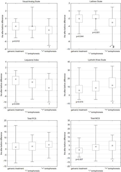 The Lysholm questionnaire, which was also used in the study, showed an improvement in the subjective assessment of the functional capacity of the knee joints among all the respondents. In all groups, there was a statistically significant difference in scores before and after the treatment. When comparing the three treatments, a statistically significant increase in the number of points was obtained after iontophoresis from the “+” anode.