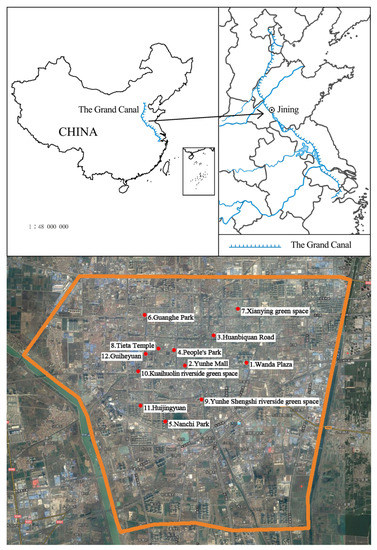 The probability sampling method was used in combination with the results of the classification of open spaces. A stratified sampling approach was adopted, whereby at least two open spaces were randomly extracted from each layer. To cover the full range of open spaces in the Jining urban area, the random sampling points were evenly distributed across the area, and the linear distance of each sample point to its nearest sample point was not greater than 1000 m. A total of 12 sample points were selected, as shown in Figure 1. The sample points of public green spaces are People’s Park, Nanchi Park, Guanghe Park, and the Xianying green space. The sample points of the roadside green space are the Tieta Temple roadside green space, the Riverside green space at the east gate of the Yunhe Shengshi residential community, and the Kuaihuolin green space. The sample points of commercial streets are Wanda Plaza, Huanbiquan Road, and Yunhe Mall. The sample points of the attached green spaces are various activity venues and inter-dwelling green spaces in the Huijingyuan residential community and the Guiheyuan residential community.
