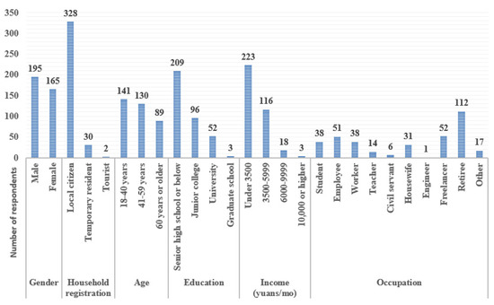 Among the 360 questionnaire respondents, 328 (91%) were local respondents, thus satisfying the requirement that most respondents be familiar with the sample points. The male-to-female ratio was 1:0.85. The age ratio of young (18–40) to middle-aged (41–59) to elderly (60 and older) [39] respondents was 1:0.92:0.63. In the present survey, age groups were chosen according to the All-China Youth Federation and the normal retirement age in China. Regarding educational level, 58% of the respondents had senior high school education or below, whereas 42% of the respondents had a junior college degree or above. Nearly two-thirds of the respondents had a monthly income lower than RMB 3500, whereas less than one-third had a monthly income of RMB 3500–6000. Regarding occupational distribution, retirees constituted the largest number of open-space users, followed by freelancers and company employees (Figure 2). Students, workers, and homemakers were active users of open spaces. Environmental quality was the most important factor affecting the respondents’ behavior.