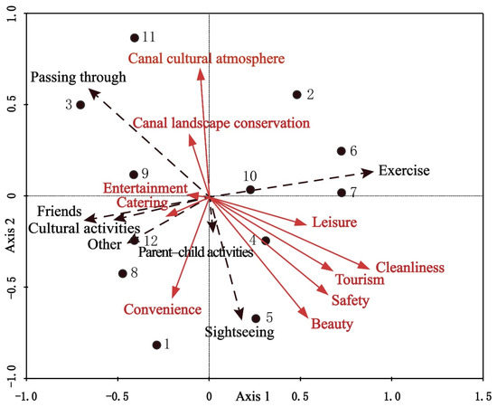 The obtained RDA ordination diagram of Jining respondents’ behaviors and environmental factors is shown in Figure 3, in which black dots represent the 12 Jining urban sample points, and arrows represent the respondents’ behaviors and environmental factors. The black radiating dashed arrows indicate respondents’ main behaviors in Jining’s open spaces, and the red radiating solid arrows indicate the evaluation factors. Longer arrows imply a greater influence of environmental factors. The angles between the arrows reflect the correlations among environmental assessment factors: an acute angle indicates a positive correlation, and an obtuse angle indicates a negative correlation. Accordingly, leisure facilities, cleanliness, tourist facilities, safety, and beauty are negatively correlated with entertainment facilities, historical features, and cultural atmosphere. Exercise behavior is highly positively correlated with leisure facilities and a clean environment. Meeting friends and cultural activities, on the other hand, are strongly positively correlated with catering and entertainment facilities, as well as with convenience.