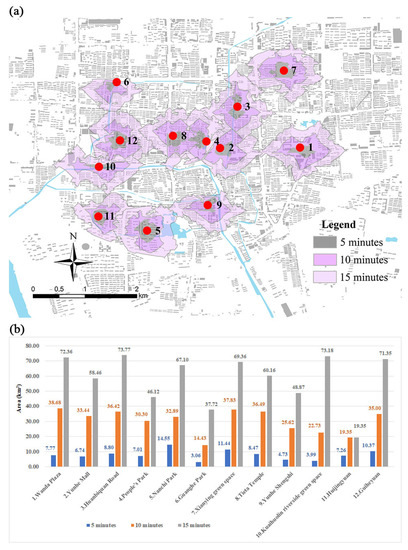 (a) Walking accessibility analysis of 12 sample points. (b) Comparison of areas of 12 sample points according to 5-, 10-, and 15-minute walking accessibility.
