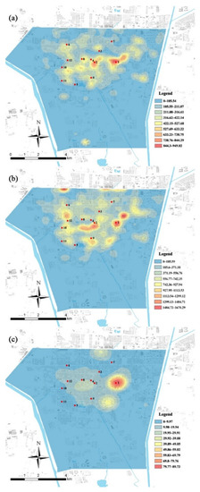 POI analysis of catering, entertainment, and tourism facilities: (a) POI analysis of catering facilities; (b) POI analysis of entertainment facilities; (c) POI analysis of tourism facilities.