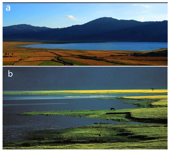 The representative scenic spots of the Koktokay Global Geopark. (a) Eremu Lake; (b) Cocosuri; (c) the No. 3 Mine Pit; (d) Betula forest; (e,f) Shenzhong Canyon.