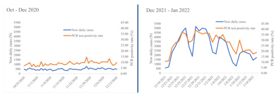 Daily new COVID-19 cases and RT-PCR test positive rate of Ethiopia as reported by the Ministry of Health during our study periods of 19 October to 13 December 2020 and 19 December 2021 to 15 January 2022 (data source: Ministry of Health-Ethiopia daily COVID-19 testing period).