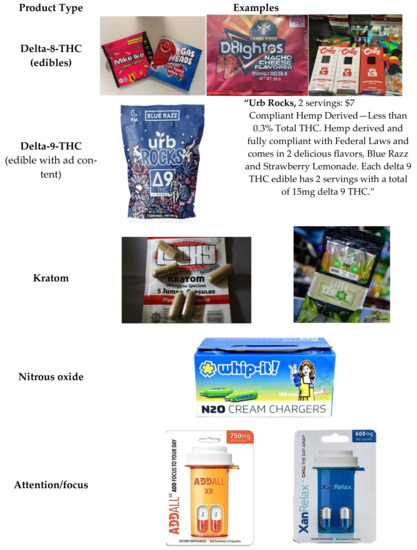 Delta-8-THC and kratom are just two categories of products that have emerged and been particularly prominent in smoke shops. Among others that have made a presence are “whippits”, Noz, and N2O—which contain nitrous oxide to be recreationally inhaled to achieve a high. These products are so readily available because some state laws (e.g., California) allow their sale to those older than 18, and/or allow sales intended for culinary and automotive use (see Figure 1). However, smoke shops have been selling these products for years [97]. These products represent just a few products represented at smoke shops—not seen at vape shops in general—and this list will likely grow.
