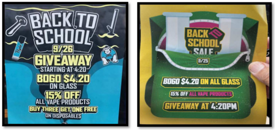 Another major concern is youth access to products at smoke shops. An analysis of 2013–2014 PATH data indicated that, among youth, the most commonly reported source for e-cigarettes and hookah was smoke shops (49.8 and 51.3%, respectively) [98]. The most common ways of accessing other tobacco products were largely from social sources or convenience stores/gas stations [98]. Moreover, another study indicated that young adult e-cigarette users (ages 18–24) represented 3.2% of those who most frequently purchased products at vape shops, but a much larger proportion (12.9%) of those who most frequently purchased products at smoke shops [79]. One likely factor determining where youth access products via retailers is retailer compliance with age verification policies, as prior research indicates that, across 2016–2018, only ~25% of youth users who tried to buy tobacco products were refused sale because of age [99]. Although FDA regulation requires retailers to check ID for all persons ≤27 years old, one study found that 49.8% of tobacco and vape shops failed to check ID for underaged decoys, a higher rate of noncompliance than for other types of retailers [62]. While one study of FDA inspection data in four states from 2017 to 2019 indicated no differences between vape vs. smoke shops in age verification compliance [100], 2019 data from California indicated noncompliance rates of 13.4% in vape shops vs. 30.6% in smoke shops [57]. Moreover, surveillance of smoke shop promotional materials have identified fliers indicating “Back to School” specials that clearly target youth (see Figure 2).