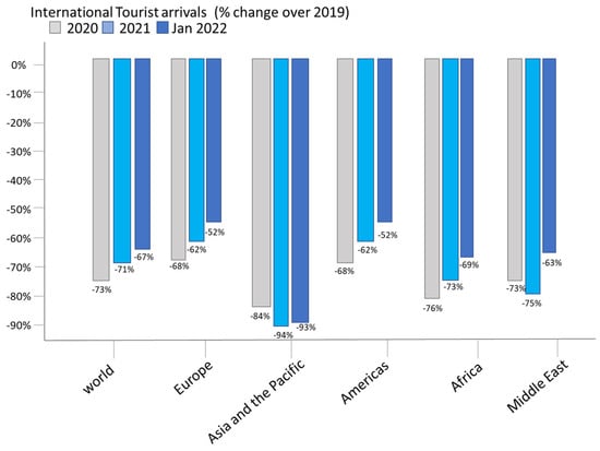 All regions experienced a significant rebound in January 2022, although it should be noted that this compares with low levels recorded in early 2021 [23], Europe (+199%) and the Americas (+97%) continue to show the best results, with international arrivals still at half of pre-pandemic levels. The Middle East (+89%) and Africa (+51%) also recorded an increase in January 2022 compared with 2021 [24], but these regions experienced a decline of 63% and 69%, respectively, compared with 2019. Although Asia-Pacific saw a 44% year-on-year increase, several destinations remained closed to non-core travel, resulting in the largest decline in international arrivals since 2019 (−93%) (See Figure 1).