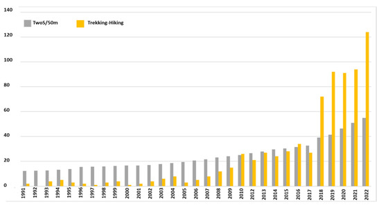 Therefore, the aim of this article is to critically analyze the scientific production on hiking and trekking as a source of tourism knowledge that has had contributions from affiliated authors in several countries taking into account the global references on this field that are increasingly identified and highlighted in order to manage pre-existing knowledge and promote a connection between research and the improvement of the current understanding of this sustainable industry [16]. Thus, based on articles published in Web of Science (WOS) journals, this paper conducted a scientometric analysis of knowledge production in walking and hiking in tourism [17] to identify the thematic areas where the issue of sustainability in tourism is currently being debated. Interest in trail tourism has grown persistently over the last three decades. This research seeks to provide an answer regarding the relationship between walking and hiking tourism research and its contribution to society at large.