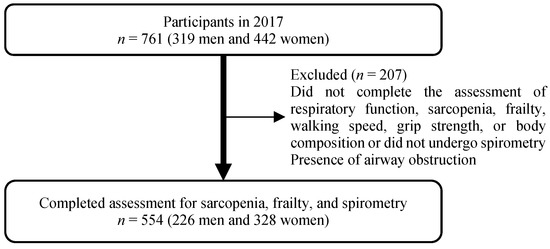 The Tokyo Metropolitan Institute of Gerontology initiated a comprehensive health checkup program called “The Otassha Study” at the Itabashi Ward of Japan in 2011 [12]. Overall, 761 (319 men and 442 women) community-dwelling older adults participated in the program in 2017 (Figure 1). The participants who completed the assessment for respiratory function, sarcopenia, frailty, walk speed, grip strength, and body composition and who underwent spirometry were included in this study; patients with chronic obstructive pulmonary disorder and airway obstruction were excluded.
