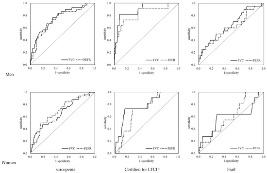 The ROC analysis results for both sexes are shown in Table 3 and Figure 2. The areas under the curve (AUCs) of the FVC and PEFR for AWGS sarcopenia and “certified for LTCI” showed a significant relationship in both sexes (AWGS sarcopenia, AUC: 0.67–0.76, p = 0.002– <0.001; LTCI, AUC: 0.70–0.90, p = 0.023– <0.001). The AUCs of the FVC and PEFR for frailty were lower than those for AWGS sarcopenia and LTCI and were not significant except for the FVC in men. Kera’s model had lower specificity for AWGS sarcopenia, LTCI, and frailty but had higher sensitivity than the JARN model, as shown in Table 4.