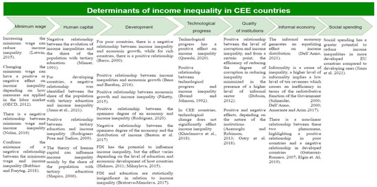The literature has identified several factors that may influence income inequalities, most often the following: minimum wage (Litwin, 2015) [25]; human capital theory (Shapiro, 2006) [26]; issues related to globalization and development (Barro, 2000; Piketty, 2015; Mihaylova, 2016) [27,28,29]; technological progress (Kharlamova et al., 2018) [30]; the quality of institutions (Acemoglu and Robinson, 2013; Ostry et al., 2018) [31,32]; the share of the informal economy (Schneider, 2000; Dell‘Anno, 2008; Amarante and Arim 2017) [33,34,35]; as well as social spending (Jianu et al., 2021) [36].