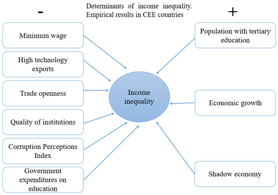 The empirical results indicated that income inequality in CEE countries is influenced by the following core determinants that kept their statistical significance in all of the specifications: minimum wage; the share of high technology exports; degree of economic openness; quality of institutions; perception index of corruption; spending on education; the share of the population employed in higher education; economic growth; and the share of the informal economy. These variables were grouped according to the impact manifested in two groups, as shown in Figure 4.