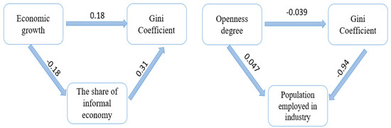 The empirical study revealed an important finding: the informal economy has a positive and statistically significant impact on income inequality, mediating the relationship between economic development and income distribution. It is generally recognized in this set of countries that the official economy impacts the informal economy and that the informal economy impacts income inequality, maintaining this function of mediation. The findings are partially validated by the research of Gutierrez-Romero (2009) [55] and Elgin et al. (2019) [56], which found that the informal economy has a favorable influence in emerging nations and a detrimental impact in rich countries, with the former being also confirmed by Dell’Anno’s study (2021) [52].