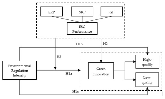 The Environmental Social and Governance (ESG) concept proposes requirements for the strategic objectives of enterprises from three aspects: environmental responsibility, social responsibility, and corporate governance, which has become an important indicator generally recognized by all countries to measure the sustainable development of enterprises under the green development model [4,5]. In order to reduce environmental costs from a long-term perspective and achieve green and sustainable development, many enterprises increase the trust of institutional investors by actively disclosing ESG information so as to alleviate their financing constraints [6]. For institutional investors, increasing R&D investment in enterprises with excellent ESG performance can not only ensure the safety of investment funds, but also benefit from the sustainable development of enterprises [7]. ESG provides a set of operable and practical sustainable development evaluation systems [8], which helps to optimize the market investment structure [9], so as to guide the flow of social capital to ecological, green, and low-carbon fields, and help to stimulate the green innovation behavior of enterprises. Thus, it is worth noting whether the increasing intensity of environmental regulation has promoted high-quality green innovation in enterprises? Does ESG performance have a positive impact on green innovation? And does ESG play a regulatory effect on the intensity of environmental regulation and green innovation? What are the differences of this effect in different types of enterprises? These are the key problems to be solved in this paper.