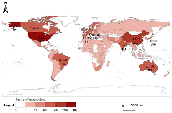 The top ten countries in the WOS document in the field of crop–livestock systems were the United States (4041 papers), China (2201 papers), Germany (849 papers), Australia (848 papers), Brazil (834 papers), the United Kingdom (627 papers), Spain (619 papers), Italy (618 papers), Canada (596 papers), and Japan (559 papers) (Figure 2). The number of published articles is 559–4041, with an in-between centrality of 0.01–1.05. The United States has the most publications among all countries, accounting for 24.30% of the total publications. The core authors of the top five publications were mostly Brazilian scholars. Brazil had formed an academic network centered on Paulo Césarde Faccio Carvalho. The authors were mainly from the Federal University of Rio Grande do Sul, the Federal University of Pará, and the University of Sao Paulo in Brazil. The core American authors, Jason A and Hubbart from West Virginia University had the fourth-largest number of papers among core scholars. Domestic scholars had formed an academic circle led by Weng Boqi, Xi Bin, and Zhou Feng. They belonged to the Key Laboratory of Agro-ecological Processes in the Red Soil Mountains of Fujian Province, the Institute of Agricultural Resources and Agricultural Zoning of the Chinese Academy of Agricultural Sciences, and the School of Urban and Environment of Peking University, respectively.