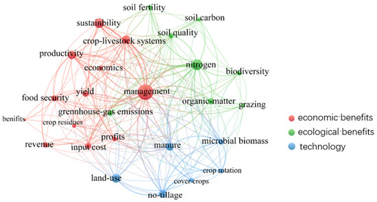 To explore research hotspots in crop–livestock system, a keyword cluster map was drawn, summarizing important research directions in crop–livestock systems (Figure 3). Keywords in the field of agronomy focusing on crop–livestock systems included crop rotation, cover crop, no-tillage, etc., in the WOS database during 1981–2021. Keywords concerning the ecological effects in crop–livestock systems included soil fertility, soil quality, nitrogen, greenhouse gas emission, biodiversity, etc. Keywords concerning economic effects of crop–livestock systems included productivity, yield, sustainability, management, etc. Keywords concerning technologies in circular agriculture in the CNKI database during 1981–2021 included organic fertilizer, biogas engineering, recycling, waste recycling, comprehensive straw utilization, etc. Keywords concerning research methods were life cycle assessment, emergy analysis, structural equation model, analytic hierarchy, etc. Keywords in ecological effects were soil fertility, soil quality, ecological cycle, etc. Then keywords in economic effects were agriculture structure adjustment, input, output, etc.