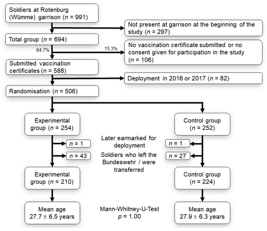 Two soldiers who, in the course of the study, were earmarked for deployment abroad were excluded from further analysis regardless of their initial allocation. This was done because vaccinations are administered with greater urgency when a deployment abroad is planned. Furthermore, soldiers who were transferred within the armed forces during the study or who left the Bundeswehr were no longer taken into consideration (n = 70). In the end, 210 participants were in the EG and 224 in the CG. An intention-to-treat analysis was carried out, i.e., all soldiers that began the study were taken into consideration. Figure 1 provides an overview of the inclusion and exclusion criteria and the numbers and ages of participants.