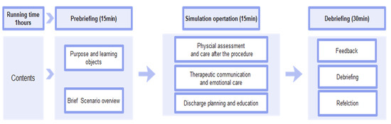 The simulation was conducted in the order of pre-briefing, simulation operation using high-fidelity manikin, and debriefing. The total running time was about 1 h (Figure 1). In the simulated scenario, women at 15 weeks’ gestation had dilatation and evacuation due to inevitable abortion and had just been transferred to the ward. The scenario consisted of three parts; the first part concerned physical assessment and care after the procedure, including pain control and possible vaginal bleeding. The second part was regarding therapeutic communication and emotional care and dealing with the patient’s worries and guilty conscience. The last part was about discharge planning and education, including answering questions from the patients about future pregnancy. In the simulation operation activity, each team comprised three to four students. One student acted as a caregiver and other students played as nurses. The reason for having two to three nurses in one room was that dealing with this bereavement situation was relatively new to nursing students and interacting with caregiver is an additional task. The instructor acted as a physician through the phone in a control room invisible to students. Before the simulation, the instructors asked students to perform nursing interventions based on the patients’ physical condition and needs. The instructors also asked students to interact with the patients, caregiver (i.e., family member), and attending physician.