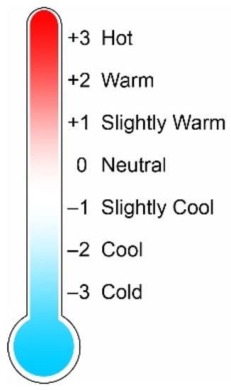 Thermal comfort is assessed by determining the PMV using a thermal sensation scale divided into 7 classes, as shown in Figure 1: +3 (Hot), +2 (Warm), +1 (Slightly warm), 0 (Neutral), −1 (Slightly cool), −2 (Cool), −3 (Cold) [,].