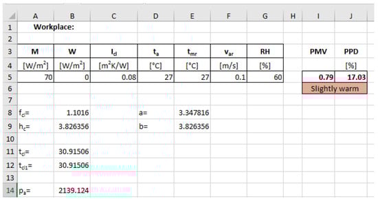 A software instrument was elaborated by the authors, using Microsoft® Excel®, for the calculation of the PMV and PPD values for an assessed workplace based on the mathematical model presented above. The caption of the sheet is presented in Figure 2, and the calculated cells and their corresponding formulas are presented in Table 1.