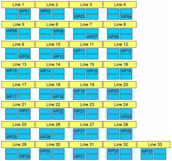 The case study was performed in a Romanian automotive industry company by analysing 33 workbenches from different production lines from the perspective of thermal comfort. The workers of this company were selected as the target participants of the study considering that the company was a partner in larger research on OHS, which includes the present study. Even if there is no registration of work accidents or occupational diseases caused directly by thermal stress, some of the workers raised an issue with thermal comfort. The analysed workplaces are located on the same open-space production floor. The target group is representative of the production floor, as it represents all of the workers at this production site. The measurements were performed simultaneously with 3 sets of instruments on one experimental day, in May, between 11 a.m. and 1 p.m., in sunny weather conditions with an outdoor temperature of 22 °C. The production floor is equipped with an air conditioning system, but the system was off at the moment of measurements. The thermal environment conditions were measured for each workplace using a heat stress monitor and an air velocity measuring instrument. The measurement height was 1.1 m since the workers’ activity is performed in an orthostatic position. The workplaces and the relevant information about workers (age and gender) are presented in Table 3. The scheme of the workplaces’ location on the production floor is represented in Figure 3.