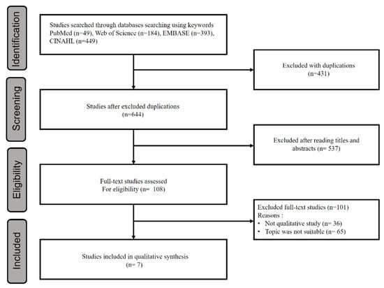 In this study, we used a traditional systematic literature review method for literature selection. We performed the literature selection process according to PRISMA’s systematic literature protocol. A literature search was conducted in March 2022. We followed the principles of the PRISMA guidelines. Prior to the literature search, the two authors discussed search strategies and databases to find appropriate literature that met the purpose and inclusion criteria of this study. The authors selected the PubMed and EMBASE databases [], which are considered the most important databases in medical field literature searches and included the Web of Science database to expand the search to the social sciences field to more comprehensively explore the characteristics of the concept. CINHAL, a database considered important in nursing field literature, was also included. The search terms were “Nursing homes [Mesh]”, “Patients [Mesh]”, “Aged [Mesh]”, “Patient-centered care [Mesh]”, and “Qualitative research [Mesh]”, which were transformed into index terms suitable for each database and searched by combining AND and OR. To achieve a broad literature search, the publication year was not specified. The criteria for literature selection in this study were (1) the participants were residents of NHs, (2) the studies were conducted using a qualitative research methodology, (3) the studies were published in English, and (4) the studies were published in peer-reviewed journals. In the case of a mixed-methods study that included a qualitative research method, only the results of the qualitative research were included if they could be clearly extracted. If participants other than NH residents were included in a study’s sample, only literature in which the results regarding resident perspectives were clearly differentiated was included. The criteria for the exclusion of literature were: (1) studies in which the results of qualitative research were not clearly revealed among studies using mixed methods research methodology, (2) studies in which it was impossible to clearly confirm the perspectives of residents, and (3) studies for which the original text could not be found. The first author performed the literature search, and the process of selecting and excluding literature according to inclusion and exclusion criteria was independently performed by the first author and the corresponding author. In the selection process, any disagreements at each stage were resolved through sufficient discussion. After the first search, 1075 articles were found, with 431 articles excluded as duplicates using Endnote. While reading the titles and abstracts, 537 unrelated documents were excluded, and the original texts of 108 documents were reviewed. In this process, the final seven studies were selected by excluding 36 studies that did not meet the qualitative research criterion and excluding 65 studies that did not match the topic (Figure 1).