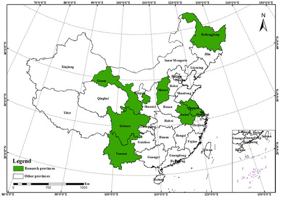 This study addresses eight provinces in China, namely, Gansu, Shaanxi, Anhui, Jiangsu, Sichuan, Yunnan, Heilongjiang, and Shanghai. The specific distribution of each province is shown in Figure 1. From July to September 2019, the research group organised three PhD students and nine MSc students, and conducted a survey in the above-mentioned provinces. We selected different villages in the same province for investigation because a village’s economic and social development directly impacts the progress and farmers’ participation in rural settlement environment improvement (Table 3). In line with the Strategic Plan for Rural Vitalisation (2018–2022), we chose suburban integration villages, characteristic protection villages, agglomeration and upgrading villages, and relocation and evacuation villages. There are differences in the location conditions and resource endowments of the four types of villages. Suburban integration villages are either villages close to cities or villages where township governments are located. Characteristic protection villages are villages with historical and cultural resources, and rural tourism resources. Agglomeration and upgrading villages are central villages with a large populations and stable economic development. Relocation and evacuation villages are villages in areas characterised by poor living conditions and a fragile ecological environment, and are prone to frequent natural disasters. The division of the surveyed villages by type allows for analysing the similarities and differences in farmers’ participation in rural settlement environment improvement at a national level.