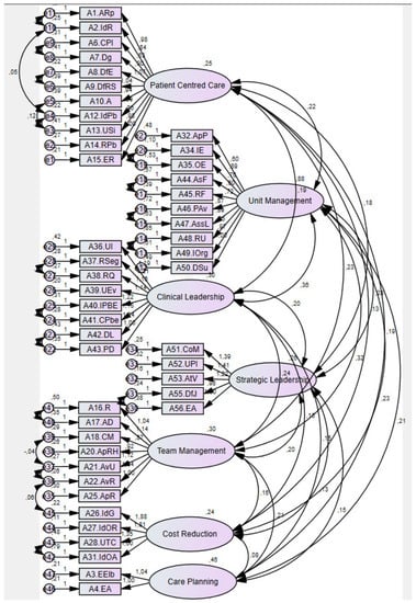 The septa-factorial model of SESCNL-PT for the Portuguese population revealed an adjustment quality with the need to correct trajectories in the model between the residues of the item pairs e42–e43, (“Cost Reduction”), e37–e39, e36–e37, e40–e41 (“Team Management”), e30–e31 (“Strategic Leadership”), e27–e28, e24–e25, e22–e23 (“Clinical Leadership”), e19–e20, e17–e18, e13–e14 (“Unit Management”), and e10–e11, e6–e7, e3–e5 (“Patient-Centred Care”). Thus, a good adjustment quality (1995.475/999 = 1.997) was obtained with RMSEA = 0.055; P [rmsea ≤ 0.05] < 0.001; MECVI = 7.005) for Standardized RMR values: 0.0723. Although the model was better adjusted, new covariances were performed between e3–e4 (“Patient-Centred Care”). Thus, the research obtained a good adjustment quality (with equal value 1973.461/998 = 1.997 and improved quality adjustment (GFI = 0.800) and Good for CFI = 0.899. The substantial value of RMSEA = 0.055; P [rmsea ≤ 0.05] < 0.001; MECVI = 6.945) was maintained for Standardized RMR values: 0.0721.