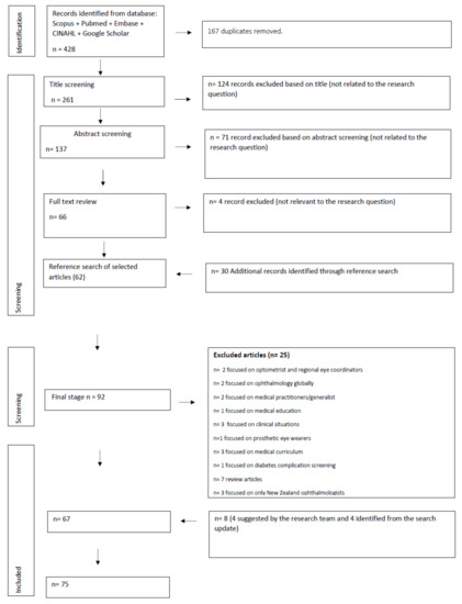 A total of 428 articles were retrieved from the literature search (Figure 1). After removing duplicates, 261 articles remained. Further, 124 records were excluded from title screening, 71 from abstract screening and 4 from full-text screening. On completion of the reference check of eligible articles, 30 additional records were identified, of which 21 were excluded because they were not related to the research question (Figure 1). Following the methodology for scoping reviews, four additional articles that met the inclusion criteria were included based on the recommendation of members of the research team. This resulted in a total of 75 articles in this review. The articles included were 4 editorials, 2 policy papers, 2 reports from the grey literature and 67 original research articles. To identify major themes, data were coded, followed by the development of descriptive themes [12]. The major descriptive themes generated from the codes included: Indigenous eye health; access and utilisation of ophthalmology-related services in rural and remote areas; service delivery models for ophthalmic care in rural and remote areas; ophthalmology workforce demographics; and ophthalmology workforce education and training for rural and remote practise.
