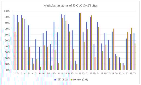 2.2. Methylation Status Assessment of Dopamine Gene Transporter (DAT1) Promoter