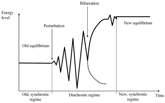 Originally, the system is in a steady-state equilibrium. It fulfils its function in its environment and is able to absorb smaller internal or external perturbations (synchronic systems regime). If the perturbations grow so strongly that they cannot be absorbed any longer within the existing structures, the system begins to fluctuate until it reaches a bifurcation point where it is obvious that the system will never be the same again. In most cases, the system will find a new equilibrium, which is adjusted relative to the new environment and usually on a higher energy level (Figure 2).