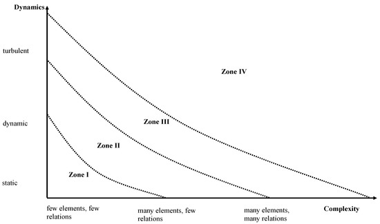 The sequence of synchronic and diachronic system regimes is not only accompanied by an increase in energy but also an increase in complexity and dynamics. Depending on the degree of complexity and dynamics, different zones of Dynaxity (I-IV) can be derived [15]. In zone I, the system consists only of a few elements and the number of interdependencies and relations between these elements is small. The number of relevant changes within a time interval (dynamics) is rather limited at well; i.e., the system can be called static. Consequently, almost all elements, their behaviour and the interdependencies are well-known; there is little uncertainty within the system. Zone I is typical for pre-industrial organisations, but even today, some private practitioners work in zone I with a small number of staff, clear hierarchies, strict control of processes and a stabile function within the village where they are located. According to Mintzberg, this is a simple structure [16].