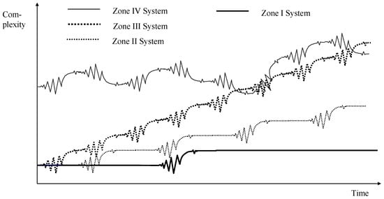 Finally, if dynamics and complexity increase even further, uncertainty will grow to a degree that makes any prediction or separation of diachronic and synchronic phases impossible. Rieckmann calls this system “Chaos” (χάος) in the sense of a state of complete disorder [12]. Proactive management becomes impossible as there is no reliable information on the interdependencies and behaviour of the multitude of different elements of the system with a complete tohu wa-bohu ((תֹהוּ וָבֹהוּ, Genesis 1:2) without any predictability. Figure 3 shows the four zones of Dynaxity.