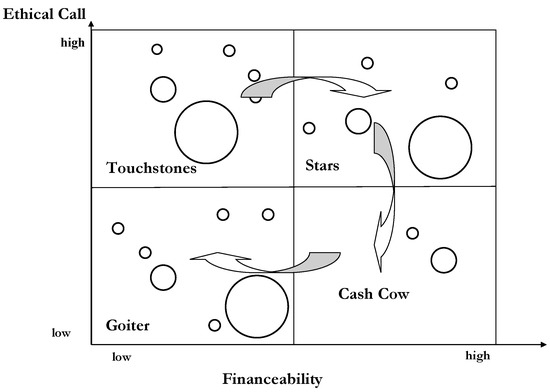 Typical instruments of strategic management are portfolio analyses, causal-loop diagrams and simulations/scenarios. A portfolio analysis is a visual presentation of the different products and their relevance for the achievement of the long-term targets. Based on the classic BCG-matrix [21], many portfolio analyses have been suggested for different purposes. For instance, Schellberg designed a portfolio matrix for nonprofit organizations distinguishing the dimensions of “ethical call” and “finance ability” [22] (Figure 6). The first dimension describes the relevance of a service for the achievement of the target system of the non-profit organisations (NPO); i.e., each NPO has to decide whether a specific service is crucial for the achievement of the target system of the NPO or not. The second dimension analyses whether an NPO can breakeven at a given financing regime. The arrows indicate that many products start as touchstones (high ethical call, but deficit), move towards stars (high ethical call, profit) and end as goiters (low ethical call, deficit).
