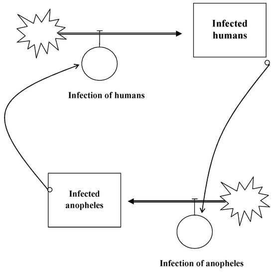 Causal loop diagrams are a visualisation of causes, consequences and interdependencies. Figure 7 shows a causal loop diagram for the infectious cycle of malaria [23]. An infected anopheles bites a non-infected human who might become infectious after some time. If another anopheles bites this infectious human, it can be infected and become—after some delay—infectious again so that the cycle starts anew. The autocatalytic cycle is the basis for exponential growth, which is very difficult to understand for human brains. However, the causal loop diagram clearly demonstrates the interdependencies between the variables. Thus, it reduces complexity and, consequently, uncertainty.