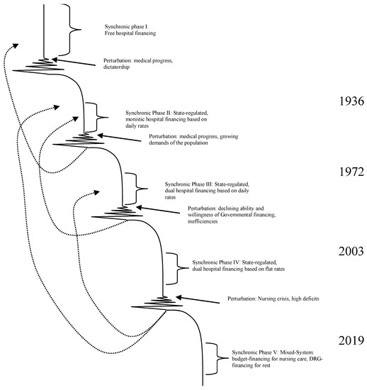 Based on Figure 8, we can conclude that German hospital financing went through a number of synchronic and diachronic system regimes. The solution of the old crisis was frequently the seedling for the new crisis [31]; i.e., it is likely that the fifth phase is not the final endpoint but new phases will occur. During the five phases, the hospital financing system developed from Dynaxity zone I to zone III. The number of changes (expressed in major regulations for hospital financing) has steadily increased in the last 100 years. While there were hardly any major alterations in the first decades, there are currently several major changes per year. The dynamics has proceeded from static to turbulent.