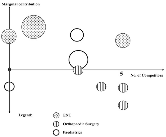 A service portfolio is a typical instrument of strategic management that has only become relevant for hospital managers in the last decades. Until 1993, hospitals could not specialize on certain services but had to provide every service in their catchment area, which was obligatory at the level of the hospital. Currently, hospitals can specialize as long as the needs of the populations are covered. In the example of Figure 9, the portfolio covers three departments (ENT, orthopaedic surgery and paediatrics) and analyses the marginal contribution and the number of competitors in the catchment area. The circles represent services, and the area of the circles is proportional to the turnover of this service.