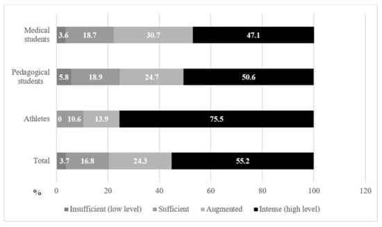 Figure 1 shows the distribution of PA levels in the three groups of students. In terms of the intensity of physical activity, the majority of respondents met the IPAQ criteria [] for a sufficient and high level. PA, which, in accordance with the recommendations, was recognized as intensive, was stated by 55.2% of the students. In 75.5% of cases, these were student-athletes. High and sufficient PA was determined in 41.1% of the respondents, and insufficient PA was determined in 3.7% of cases (5.8% of pedagogical students and 3.6% of future doctors). Only half of the cases of the students from these two groups fell into the highly active group in terms of PA. The group of student-athletes made up a significant share of the high level of PA.
