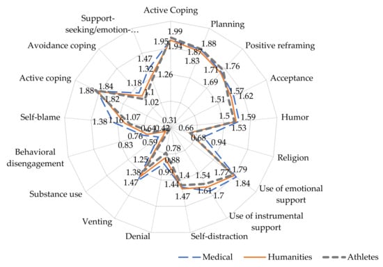 It is assumed that the decrease in PA and dissatisfaction with life are due to restrictions in physical exercises based on sports clubs and fitness centers. Home workouts could not replace classes at the sports center [] but still leveled the deficit of movement []. Perhaps this is why student-athletes were characterized by a higher degree of life satisfaction and less pronounced indicators of perceived stress. Many authors note that tough anti-epidemic measures have reduced the level of training of athletes, life satisfaction, and mental health in general compared with the stages of life normalization []. In our study, there was no significant decrease in life satisfaction and a pronounced deterioration in sports performance in this group of students. In turn, the group of future doctors is distinguished by a pronounced degree of the perception of stress, which is consistent with the studies of other authors [,], and suggests that the specifics of training can potentiate a high level of stress in both medical and pedagogical students []. Students of medical specialties had a significantly higher perception of stress than their peers from the other groups. The minimum indicator was noted among student-athletes. The severity of the indicator in female students prevails over the data of male students. The results of the assessment on the “Overload subscale” confirmed a higher level of stress among medical students. The indicators of the female students were also significantly higher than those of the male students. Because stress causes psychological responses, it is important to have an idea about the options for responding to an extreme situation. The study of human behavior in stressful situations makes it possible to identify coping mechanisms that determine the success and failure of adaptation. The appeal of certain strategies for coping with stress in a pandemic situation among students is associated with several factors: the specifics of the conditions and anti-epidemiological measures, the characteristics of the training profile, and gender.
