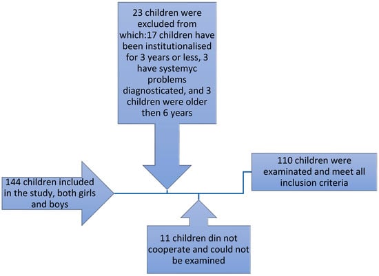 Our study was carried out over a period of 2 years and 6 months, starting from September 2018 until March 2021, in the Private Dental Clinic StoicaMed from Targu-Mures, Mures County. The methodology and design of the study were approved by the ethics committee of the clinic (no. 37/15 September 2018). In order to begin the study, we obtained the written approval consent of the legal guardians of the institutionalized children, but also of the managers of these centers. The clinical examination and data recording was performed by 4 specialized dentists, with more than 4 years of experience in pedodontics. We selected and included in the study144 children, both boys and girls in equal number, meeting the following criteria of inclusion: Ages of 5 or 6 years old, the presence of temporary teeth in complete formula, clinically healthy, their presence in the orphanage for at least 4 years. The exclusion criteria were: Children under 5 years of age or older than 6 years, children with general or systemic problems, children who have recently been institutionalized (Figure 1). Regarding the section of general and systemic problems, the list included: Associated psychiatric and mental disorders, genetic syndromes, multisystemic pediatric inflammatory syndrome, and congenital disorders.