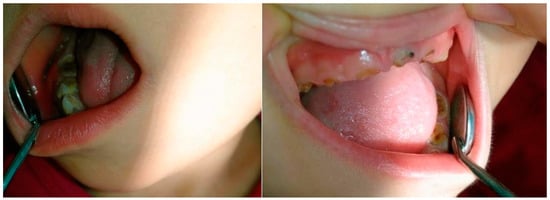 Primary teeth have an essential role in maintaining space on the dental arches for the future permanent teeth and for the harmonious orofacial development of the child. Even though early severe childhood caries can be prevented, it currently affects more than 600 million children globally and remains an ignored pathology by most parents or caregivers due to the lack of information regarding dental health. Untreated, severe childhood caries have a major impact on the children’s life quality, and also on the whole family, being considered an unnecessary burden on society [4,5,6]. A child with advanced tooth decay cannot eat properly, has poor sleep, slowed growth, sometimes irritability, and when caries becomes complicated, they present decreased ability to concentrate.